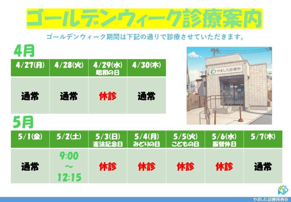 ゴールデンウィーク期間中、誠に勝手ではございますが下記表通りの診療となります。